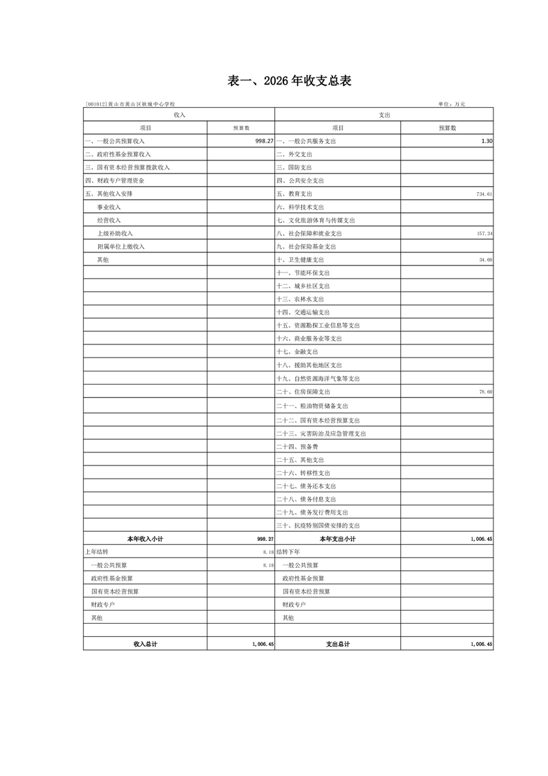 按照综合预算的原则,黄山区耿城中心学校所有收入和支出均纳入部门预算管理。黄山区耿城中心学校2026年收支总预算1006.45万元,收入包括一般公共预算拨款收入、上年结转,支出包括:一般公共服务、教育支出、社会保障和就业支出、卫生健康支出、住房保障支出。