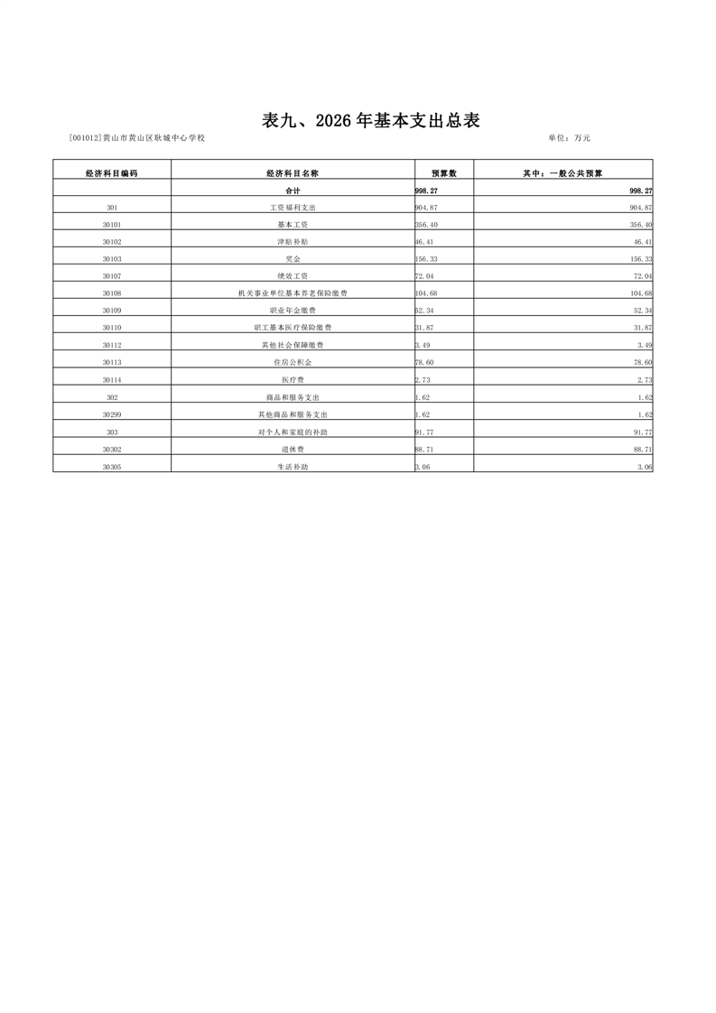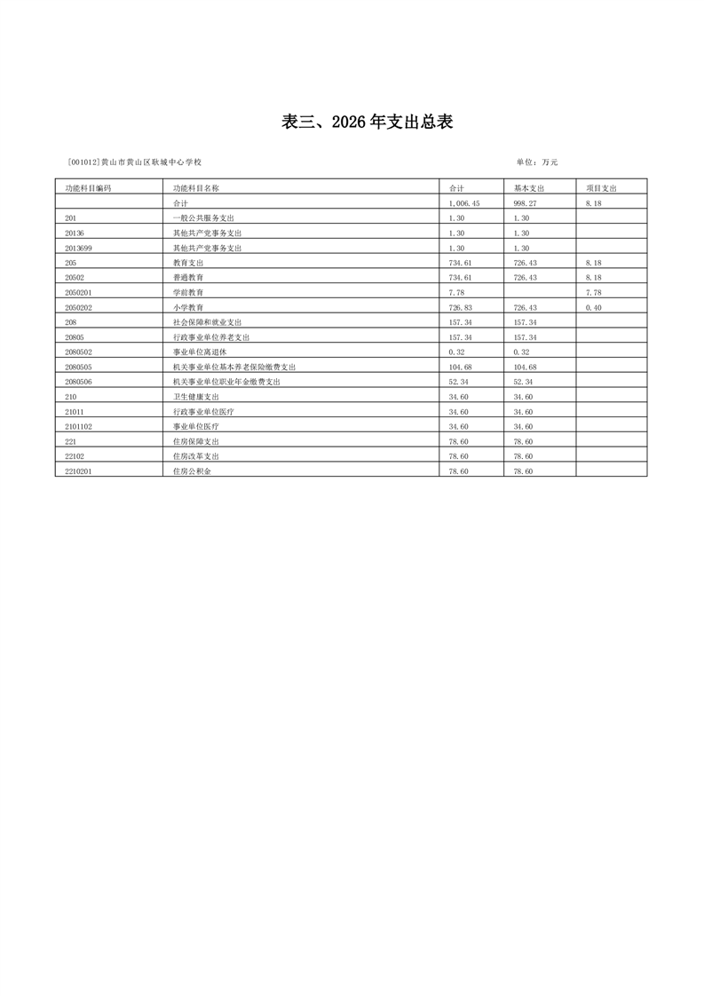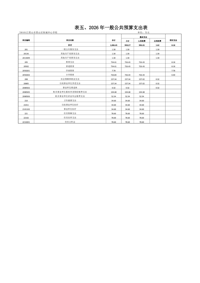 黄山区耿城中心学校2026年一般公共预算基本支出1006.45万元,其中: