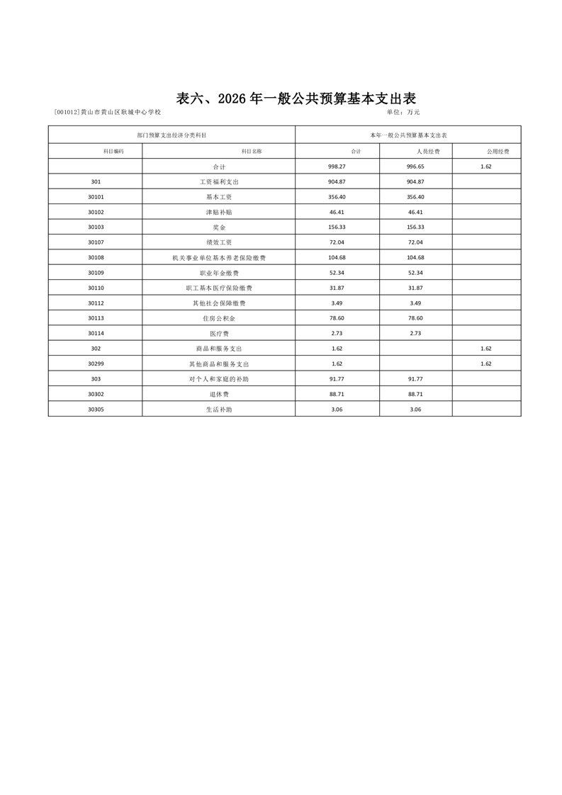6.黄山区耿城中心学校2026年一般公共预算基本支出表