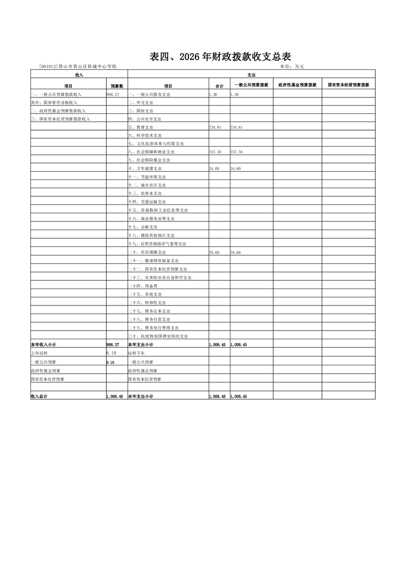 4.黄山区耿城中心学校2026年财政拨款收支预算总表
