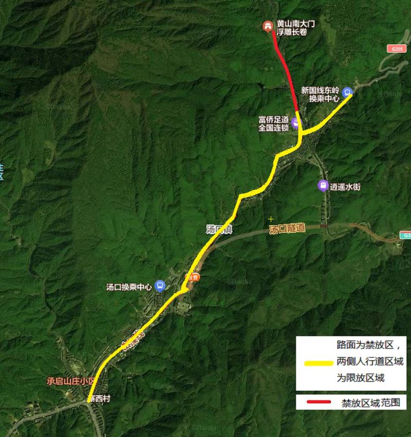 (九)汤口镇域解放桥至黄山南大门牌楼公路及两侧区域;寨西桥至解放桥、汤口大桥至汤口东岭公路路面。