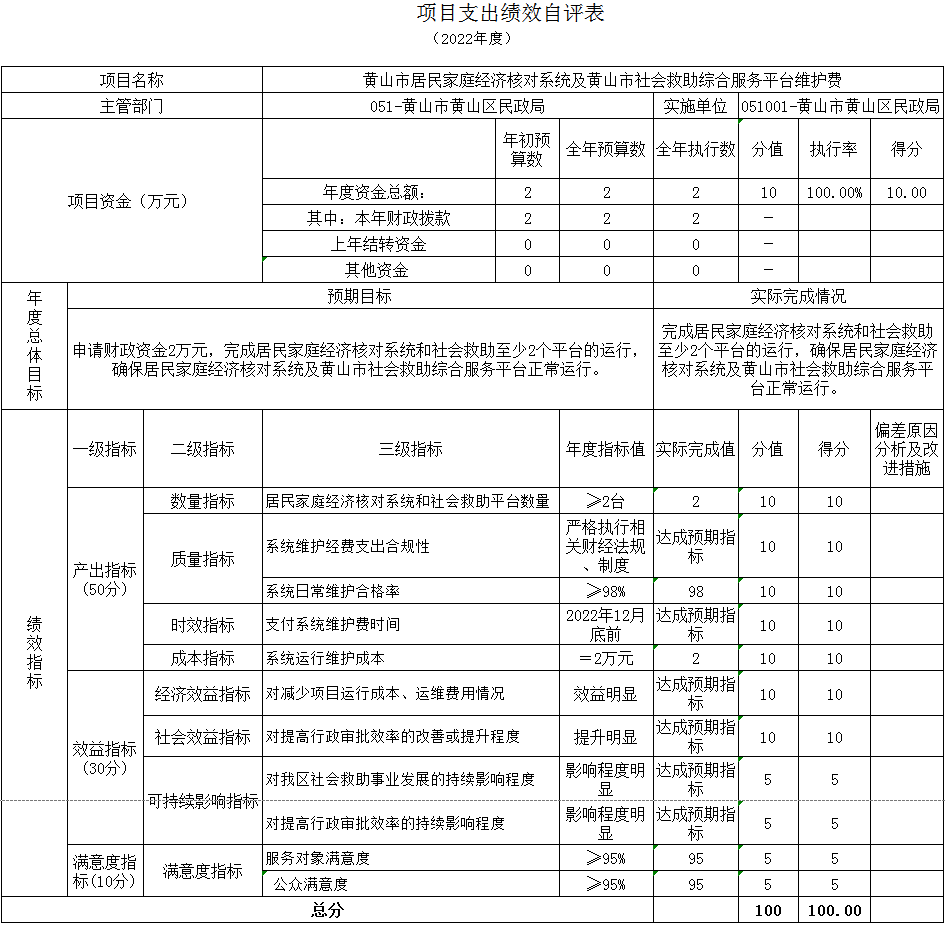 黄山市居民家庭经济核对系统及黄山市社会救助综合服务平台维护项目绩效自评综述:根据年初设定的绩效目标,项目绩效自评得分为100分。项目全年预算数为2万元,执行数为2万元,完成预算的100%。主要产出和效果:通过项目实施,按时支付平台维护费,确保了居民家庭经济核对系统及黄山市社会救助综合服务平台正常运行。