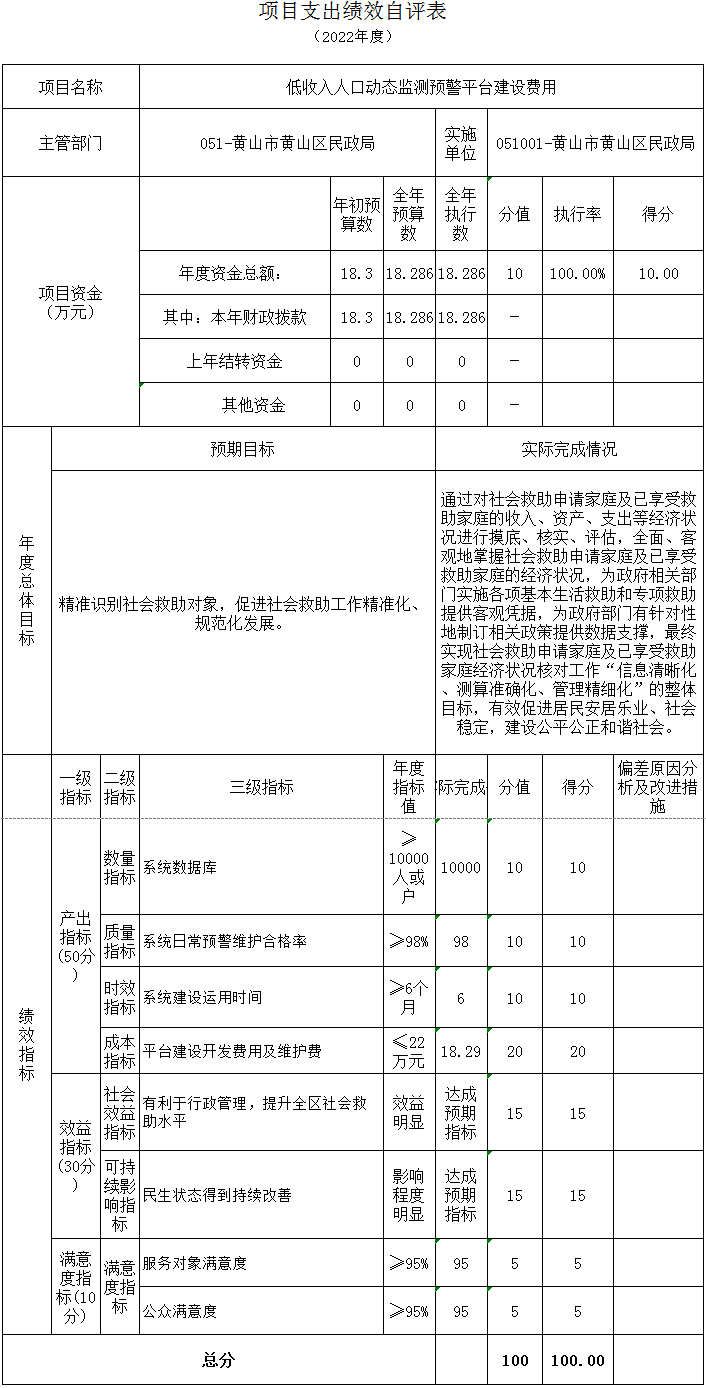 低收入人口动态监测预警平台建设项目绩效自评综述:根据年初设定的绩效目标,项目绩效自评得分为100分,项目全年预算数18.3万元,执行数18.3万元,预算执行率100%。主要产出和效果:通过项目实施,贯彻落实黄山市委办公室、黄山市政府办公室《关于改革完善社会救助制度的实施意见》,加强社会救助与巩固拓展脱贫攻坚成果同乡村振兴有效衔接,切实兜住兜牢基本民生保障底线。由市民政局牵头,市乡村振兴、教育、医保、住建、卫健、残联等相关部门配合建立市社会救助监测预警平台。