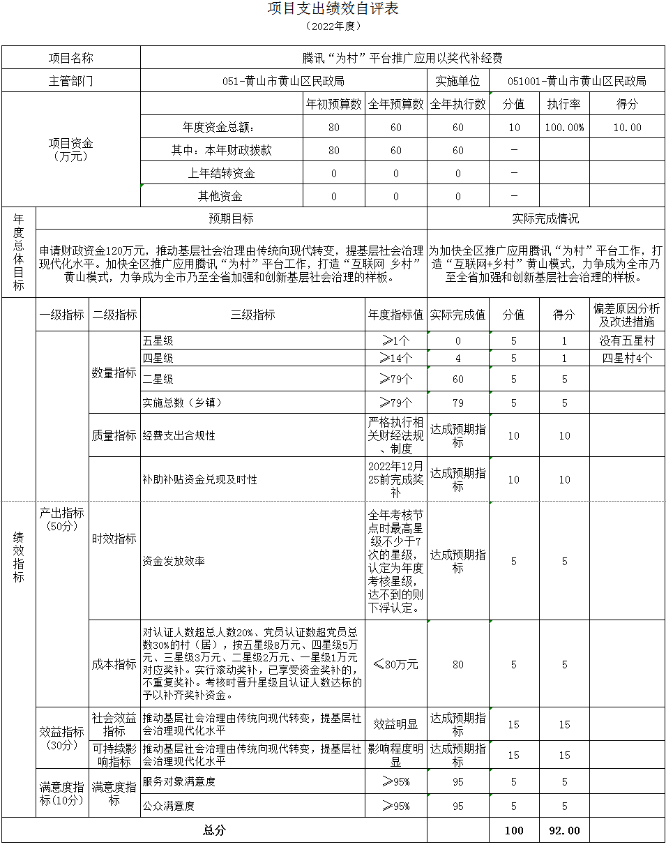 腾讯“为村”平台推广应用以奖代补项目绩效自评综述:根据年初设定的绩效目标,项目绩效自评得分为89.5分,项目全年预算数80万元,执行数60万元,预算执行率75%。主要产出和效果:通过项目实施,推动基层社会治理由传统向现代转变,提升基层社会治理现代化水平。