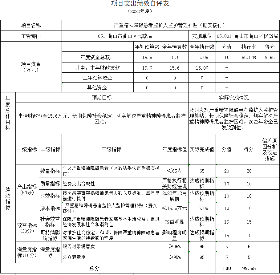 严重精神障碍患者监护人监护管理补贴项目绩效自评综述:根据年初设定的绩效目标,项目绩效自评得分为99.65分,项目全年预算数15.6万元,执行数15.06万元(据实拨付),预算执行率96.54%。主要产出和效果:通过项目实施,保障社会稳定、切实解决严重精神障碍患者监护困难。
