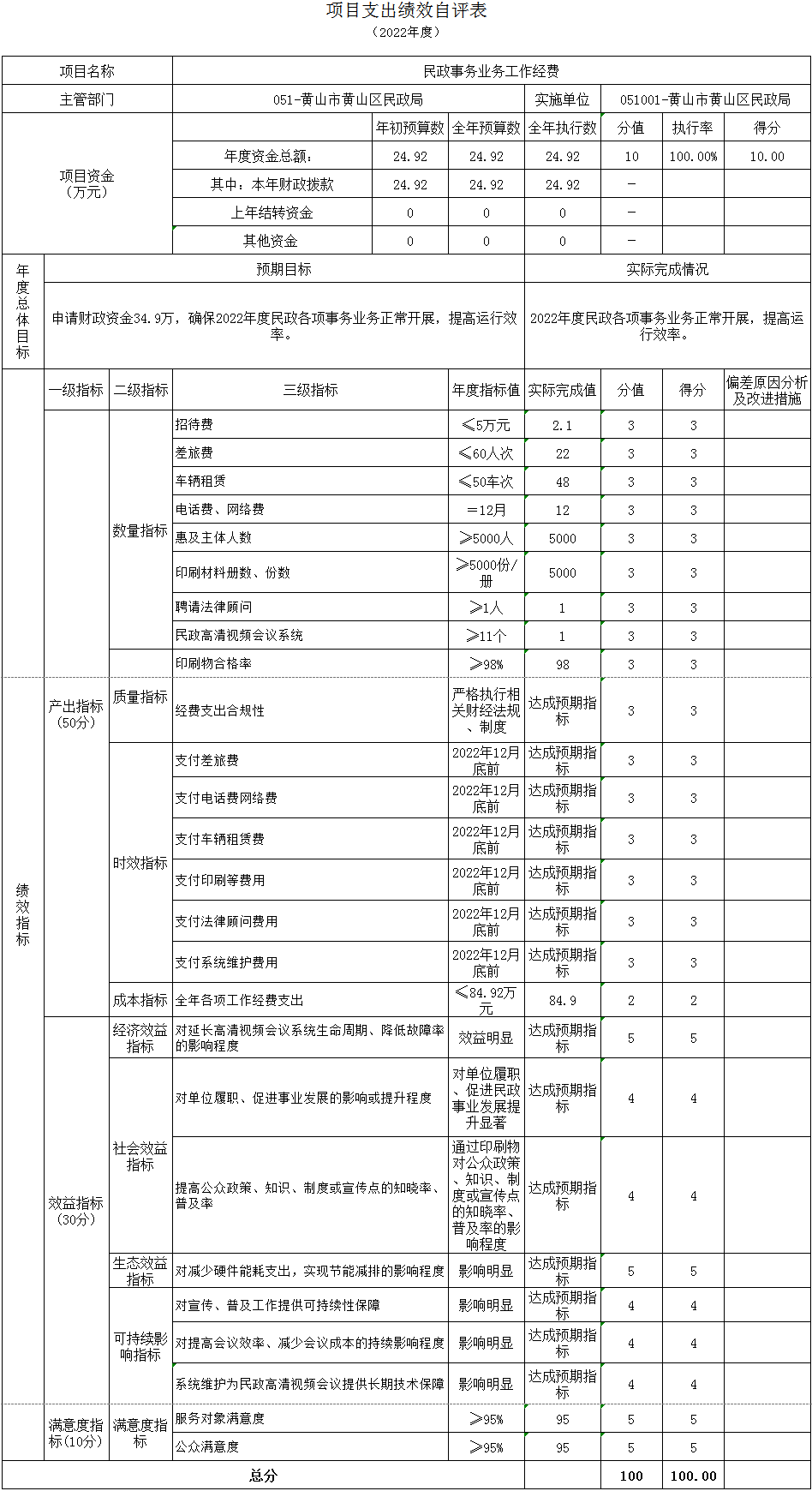 业务及事务工作经费项目绩效自评综述:根据年初设定的绩效目标,项目绩效自评得分为100分,项目全年预算数84.92万元,执行数84.9万元,预算执行率100%。主要产出和效果:通过项目实施,确保了2022年度民政各项工作的正常开展,提高了运行效率。