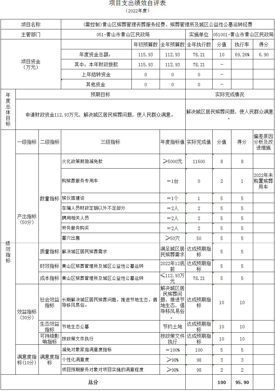 (需控制)黄山区殡葬管理丧葬服务经费、殡葬管理所及城区公益性公墓运转项目绩效自评综述:根据年初设定的绩效目标,(需控制)黄山区殡葬管理丧葬服务经费、殡葬管理所及城区公益性公墓运转项目绩效自评得分为95.9分,项目全年预算数112.93万元,执行数78.21万元,预算执行率69.26%;主要产出和效果:通过项目实施,长期解决城区居民殡葬需求,推进节地生态,倡导移风易俗。发现的主要问题:因城区公益性公墓殡仪馆建设尚未完工,所以不能及时安排殡仪用车的采购,导致预算执行率不够。下一步改进措施:结合绩效目标合理调节预算,提高资金使用效率。