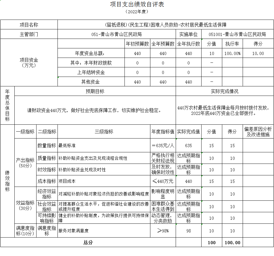 (民生工程)困难人员救助-农村居民最低生活保障项目绩效自评综述:根据年初设定的绩效目标,项目绩效自评得分为100分,项目全年预算数440万元,执行数440万元,预算执行率100%。主要产出和效果:通过项目实施,在惠民生、解民忧、保稳定、促和谐等方面作出突出贡献,有效保障困难群众的基本生活。