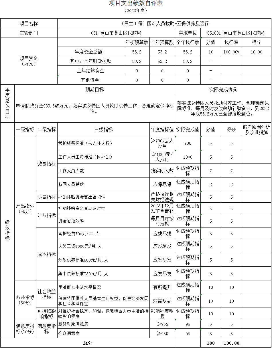(民生工程)困难人员救助-五保供养及运行项目绩效自评综述:根据年初设定的绩效目标,项目绩效自评得分为100分,项目全年预算数53.2万元,执行数53.2万元,预算执行率100%。主要产出和效果:通过项目实施,用于特困人员供养和机构运行维护,保障困难人员基本生活,维护社会和谐稳定。