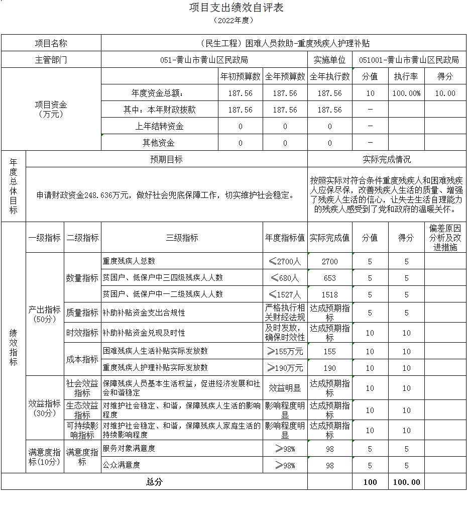 (民生工程)困难人员救助-重度残疾人护理补贴项目绩效自评综述:根据年初设定的绩效目标,项目绩效自评得分为100分,项目全年预算数187.56万元,执行数187.56万元,预算执行率100%。主要产出和效果:通过项目实施,按照实际对符合条件的重度残疾人应保尽保,通过重度残疾人护理补贴项目的持续实施,改善了残疾人生活的质量、增强了残疾人生活的信心,让失去生活自理能力的残疾人感受到了党和政府的温暖关怀。