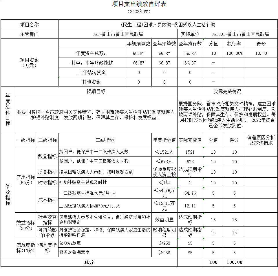(民生工程)困难人员救助-贫困残疾人生活补助项目绩效自评综述:根据年初设定的绩效目标,项目绩效自评得分为100分,项目全年预算数66.87万元,执行数66.87万元,预算执行率100%。主要产出和效果:通过项目实施,按照实际对符合条件的困难残疾人应保尽保,改善了残疾人生活的质量、增强了残疾人生活的信心,让失去生活自理能力的残疾人感受到了党和政府的温暖关怀。