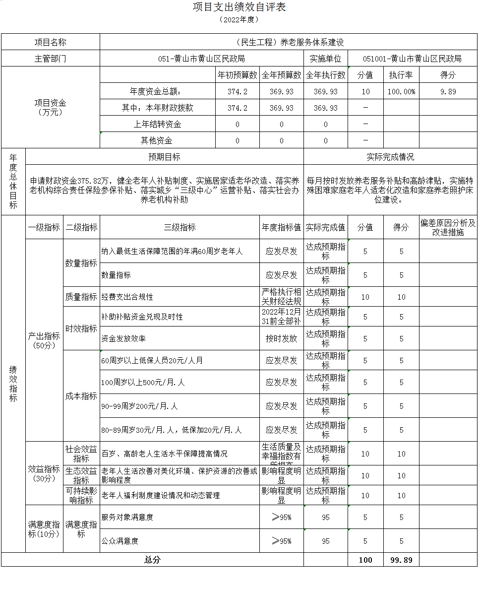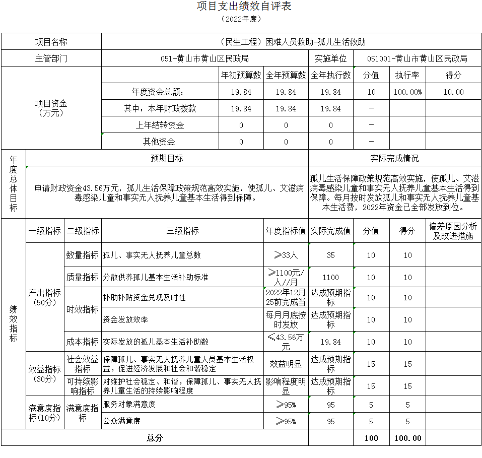 根据预算绩效管理要求,本部门组织对2022年度纳入部门预算的项目支出全面开展了绩效自评,共14个项目,涉及资金1459.42万元,占项目预算总额的100%。绩效目标和指标:黄山市居民家庭经济核对系统及黄山市社会救助综合服务平台维护项目确保了居民家庭经济核对系统及黄山市社会救助综合服务平台正常运行;低收入人口动态监测预警平台建设项目贯彻落实黄山市委办公室、黄山市政府办公室《关于改革完善社会救助制度的实施意见》,加强社会救助与巩固拓展脱贫攻坚成果同乡村振兴有效衔接,切实兜住兜牢基本民生保障底线;腾讯“为村”平台推广应用以奖代补项目推动基层社会治理由传统向现代转变,提升基层社会治理现代化水平;严重精神障碍患者监护人监护管理补贴项目,保障社会稳定、切实解决严重精神障碍患者监护困难;(需控制)黄山区殡葬管理丧葬服务经费、殡葬管理所及城区公益性公墓运转项目长期解决城区居民殡葬需求,推进节地生态,倡导移风易俗;民政业务工作经费及民政事务工作经费项目,确保了2022年度民政各项工作的正常开展,提高了运行效率;(民生工程)困难人员救助-农村居民最低生活保障项目在惠民生、解民忧、保稳定、促和谐等方面作出突出贡献,有效保障困难群众的基本生活;(民生工程)困难人员救助-五保供养及运行项目保障困难人员基本生活,维护社会和谐稳定;(民生工程)困难人员救助-重度残疾人护理补贴项目按照实际对符合条件的重度残疾人应保尽保,通过重度残疾人护理补贴项目的持续实施,改善了残疾人生活的质量、增强了残疾人生活的信心,让失去生活自理能力的残疾人感受到了党和政府的温暖关怀;(民生工程)困难人员救助-贫困残疾人生活补助项目按照实际对符合条件的困难残疾人应保尽保,改善了残疾人生活的质量、增强了残疾人生活的信心,让失去生活自理能力的残疾人感受到了党和政府的温暖关怀;(民生工程)困难人员救助-孤儿生活救助项目按照实际对符合条件的儿童应保尽保,大大缓解孤儿的生活压力提高了孤儿及事实无人扶养儿童的生活质量,保障他们生活和受教育的权益;(民生工程)养老服务体系建设项目按照实际对符合条件的老年人应保尽保,及时发放年满80周岁及以上老人高龄津贴及60周岁以上低保老人养老服务补贴,保障老年人权益,提高老年人生活质量水平;(民生工程)困难人员救助-生活无着人员救助项目确保生活无着的流浪乞讨人员不脱管、漏管,全面提升我区流浪乞讨人员救助管理服务工作水平,为建设绿色发展示范区、美丽幸福新黄山做出新的贡献。