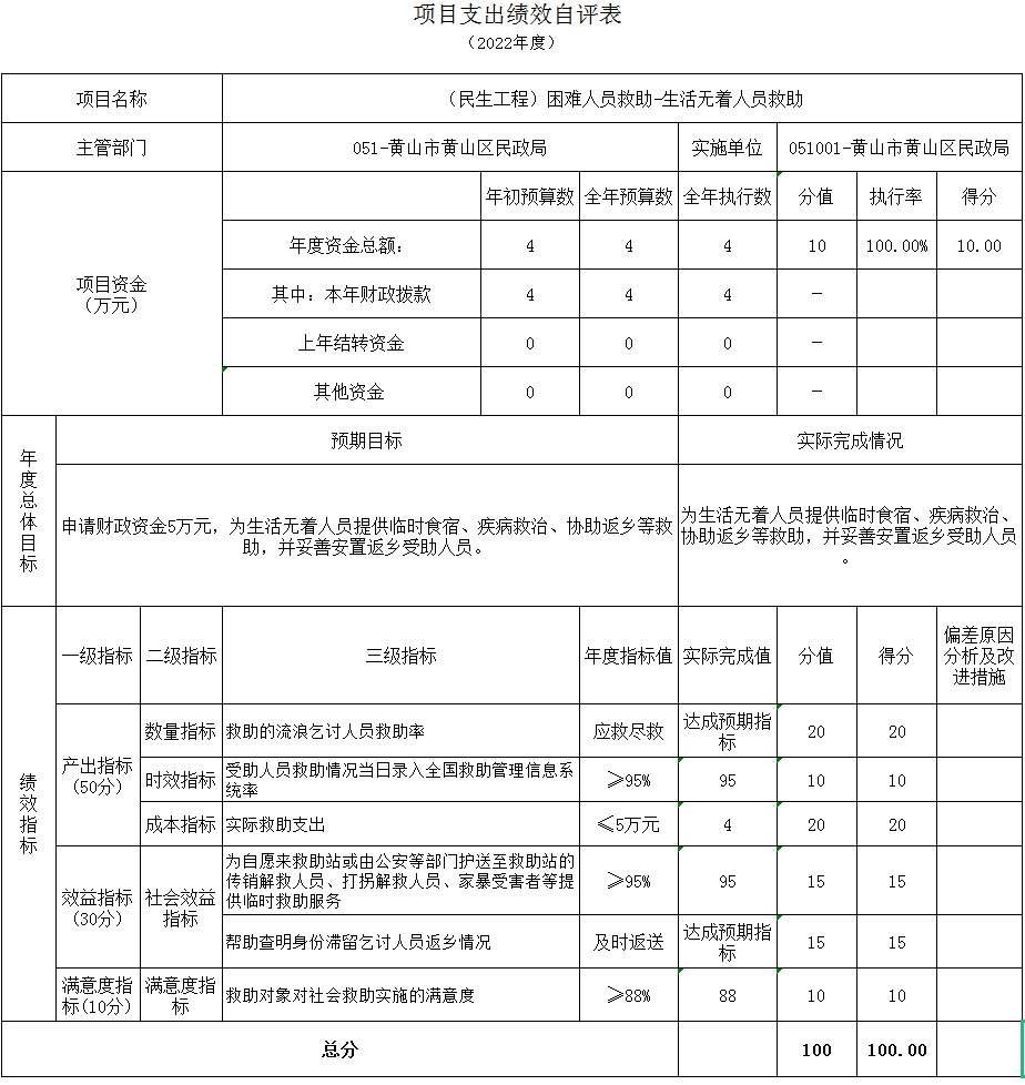 (民生工程)困难人员救助-生活无着人员救助项目绩效自评综述:根据年初设定的绩效目标,项目绩效自评得分为100分,项目全年预算数4万元,执行数4万元,预算执行率100%。主要产出和效果:通过项目实施,确保生活无着的流浪乞讨人员不脱管、漏管,不发生有较大影响的案事件,全力确保生活无着的流浪乞讨人员救助管理和疫情防控“两大安全”。全面提升我区流浪乞讨人员救助管理服务工作水平,为建设绿色发展示范区、美丽幸福新黄山做出新的贡献,为党的二十大胜利召开营造良好的政治和社会环境。