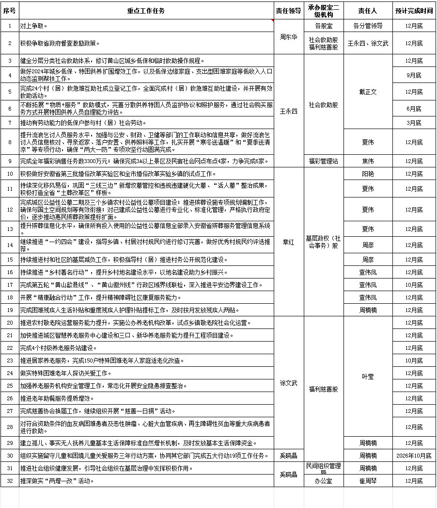 黄山区民政局2024年重点工作任务分解表