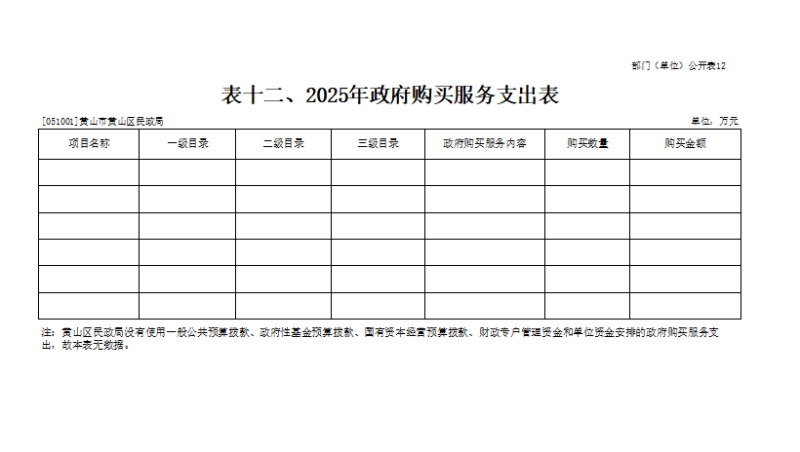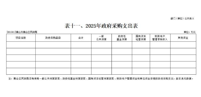 黄山区民政局2025年(各)单位政府采购预算总额0万元。其中:政府采购货物预算0万元,政府采购工程预算0万元,政府采购服务预算0万元。
