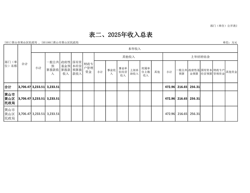 按照综合预算的原则,黄山区民政局所有收入和支出均纳入部门预算管理。黄山区民政局2025年收支总预算3706.47万元,收入包括一般公共预算拨款收入3233.51万元、上年结转收入472.96万元,支出包括:一般公共服务1.8万元、社会保障和就业支出3420.91万元、卫生健康支出8.29万元、住房保障支出19.16万元、其他支出256.31万元。