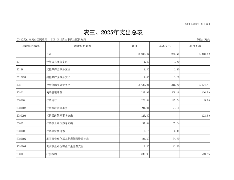 黄山区民政局2025年一般公共服务支出1.8万元,占0.05%;社会保障和就业支出3420.91万元,占99.15%;卫生健康支出8.29万元,占0.24%;住房保障支出19.16万元,占0.56%。