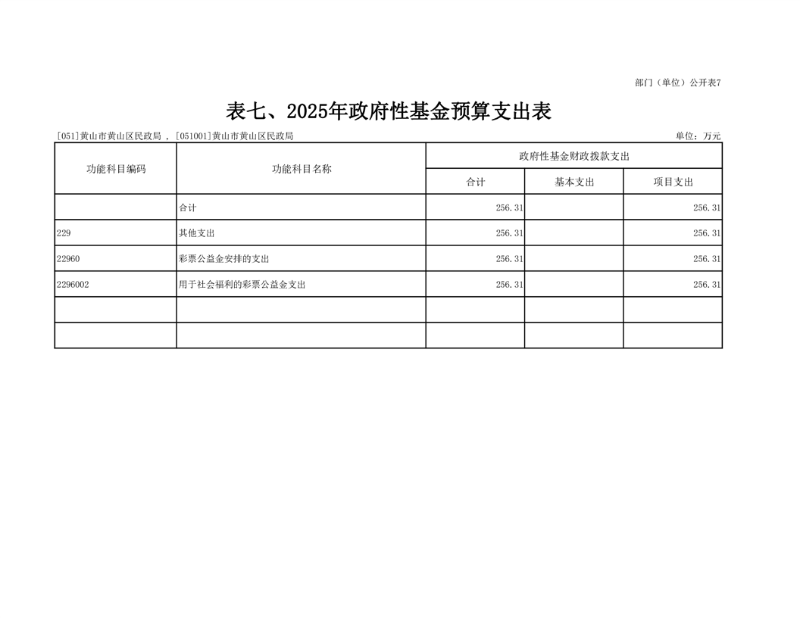黄山区民政局2025年政府性基金预算拨款256.31万元,比2024年预算拨款增加90.62万元,增长54.69%,主要原因是上年结转福彩公益金256.31万元。具体情况如下: