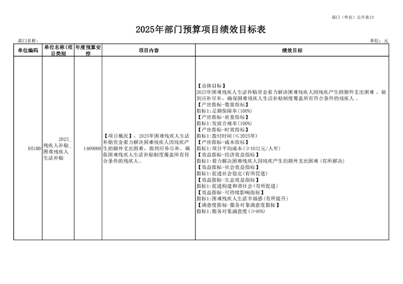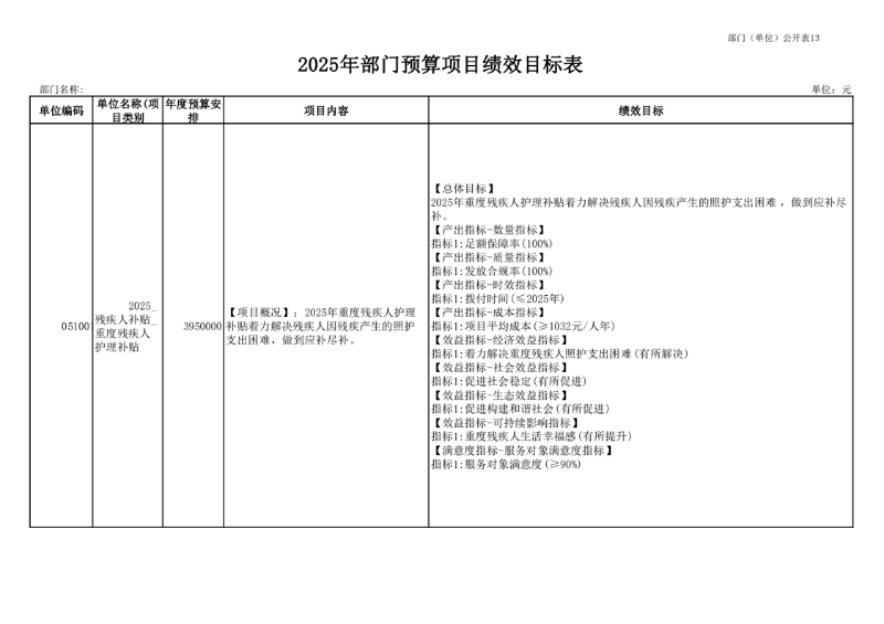 (1)项目概述:着力解决重度残疾人因残疾产生的额外长期照护支出困难,做到应补尽补,确保重度残疾人护理补贴制度覆盖所有符合条件的残疾人。