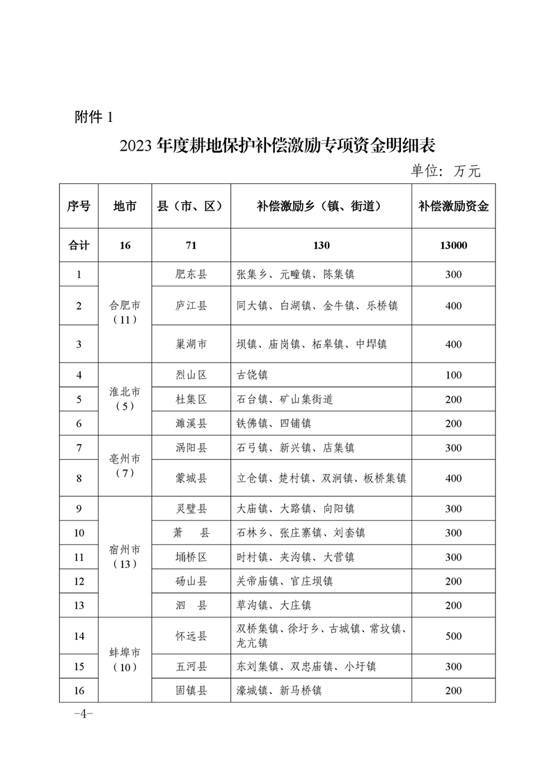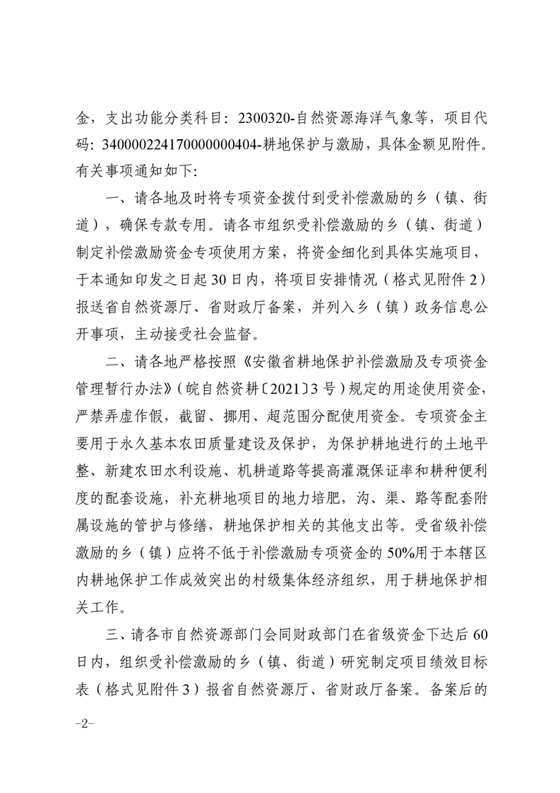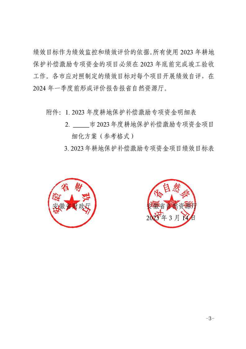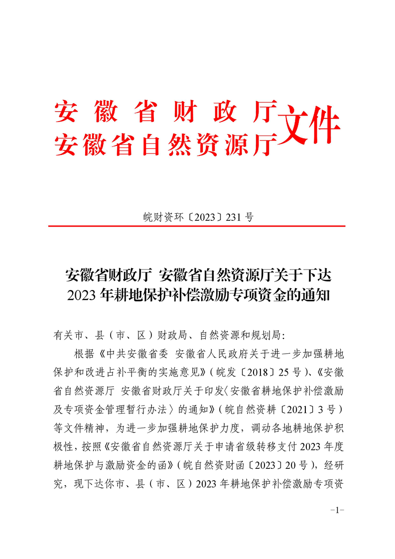 安徽省财政厅 安徽省自然资源厅关于下达2023年耕地保护补偿激励专项资金的通知