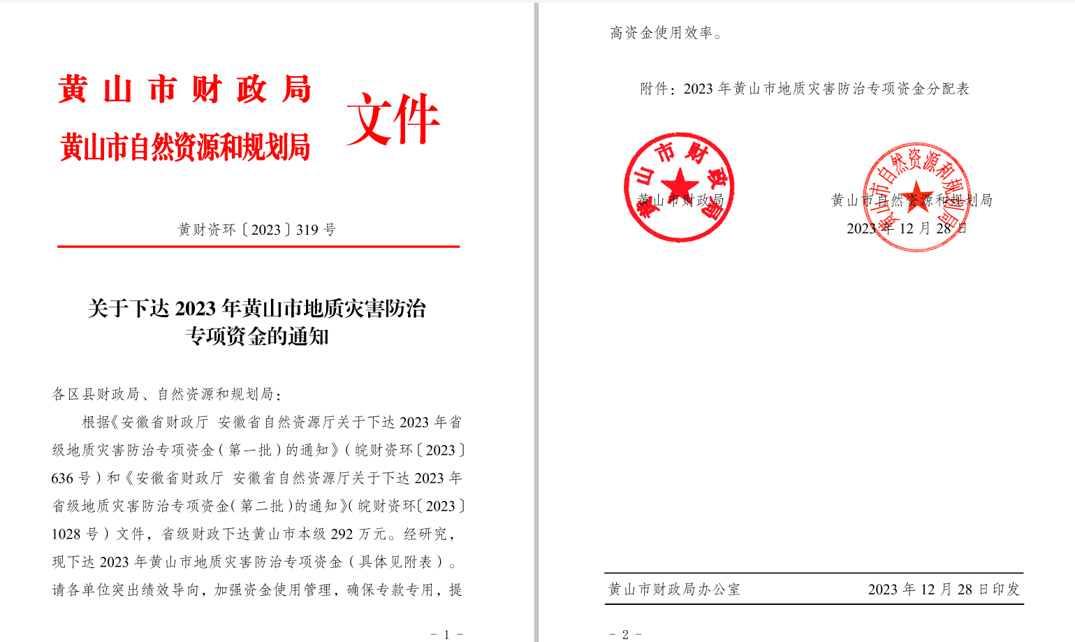 关于下达2023年黄山市地质灾害防治专项资金的通知