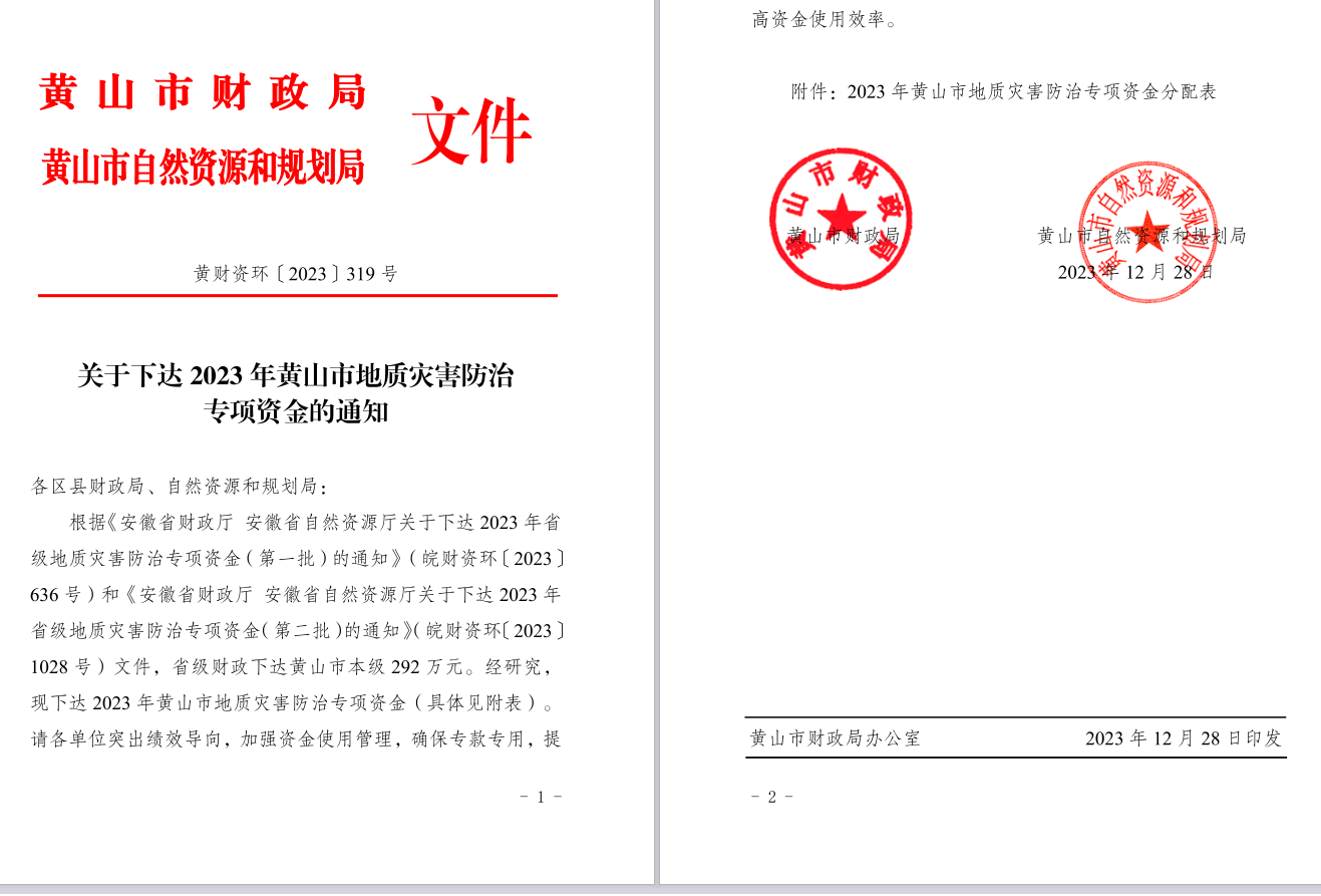 转发《关于下达2023年黄山市地质灾害防治专项资金的通知》
