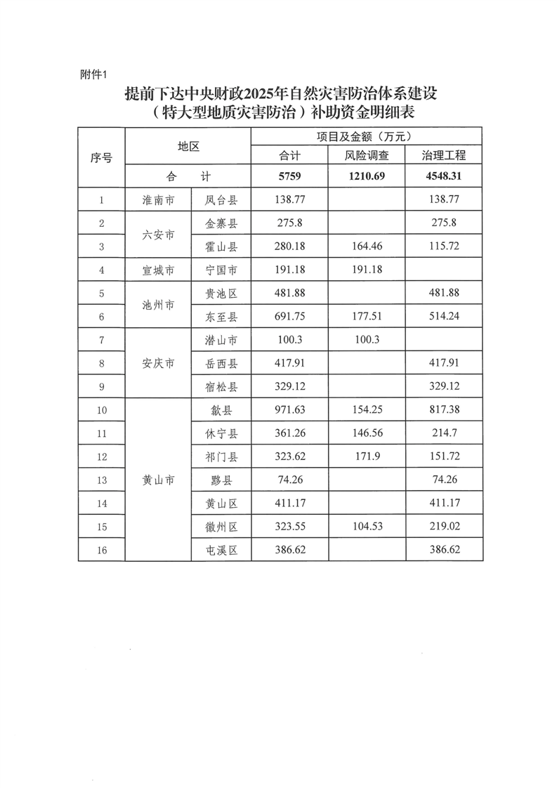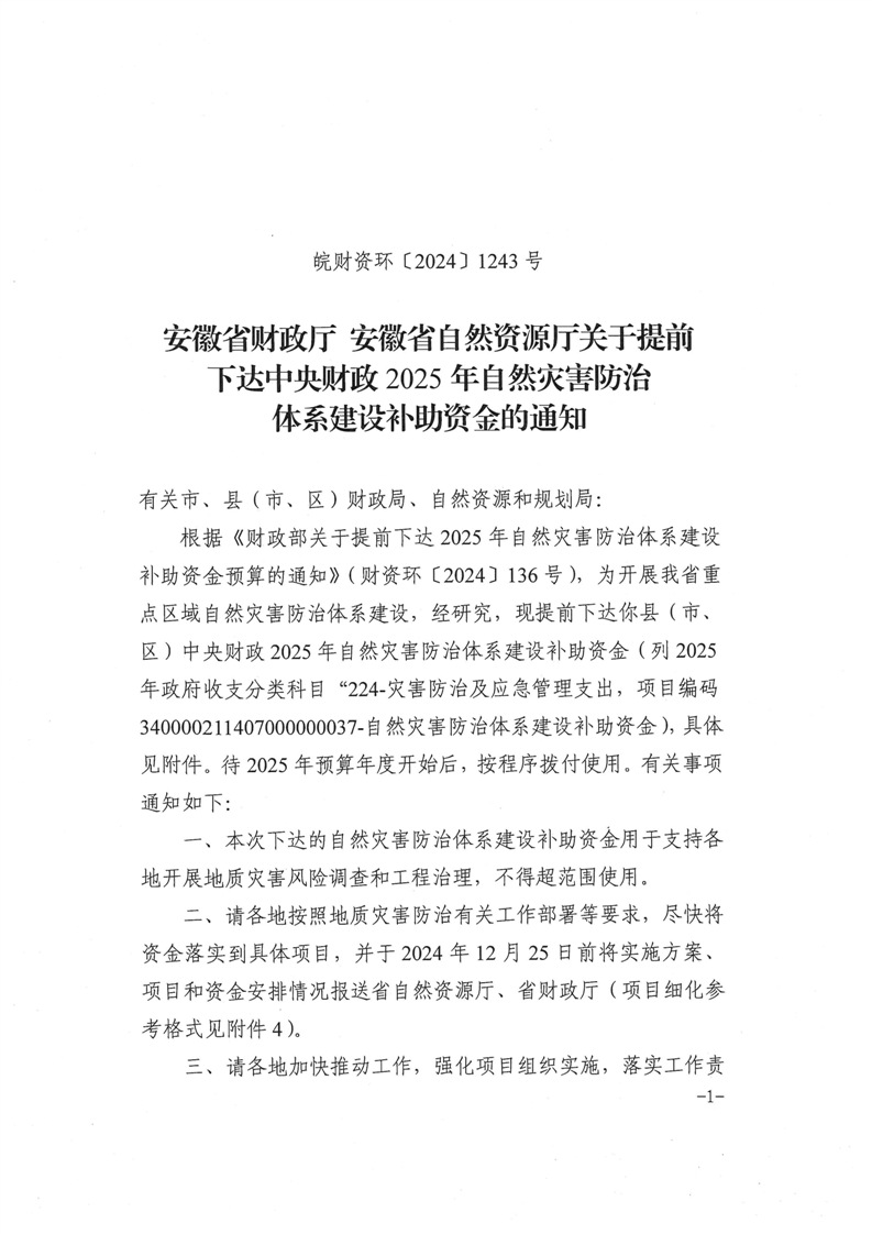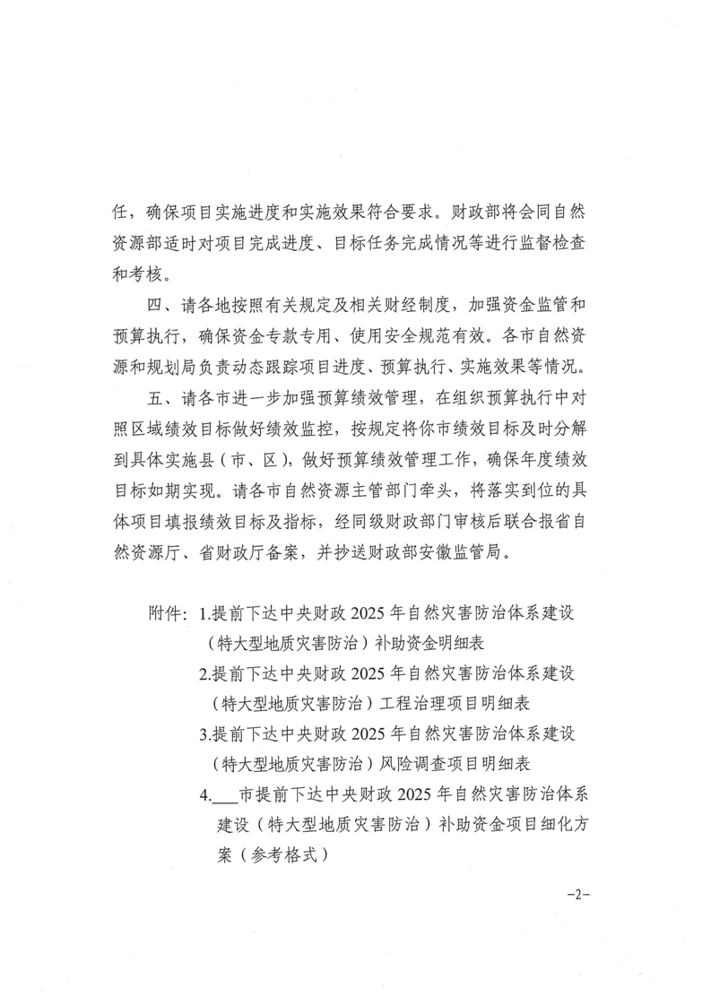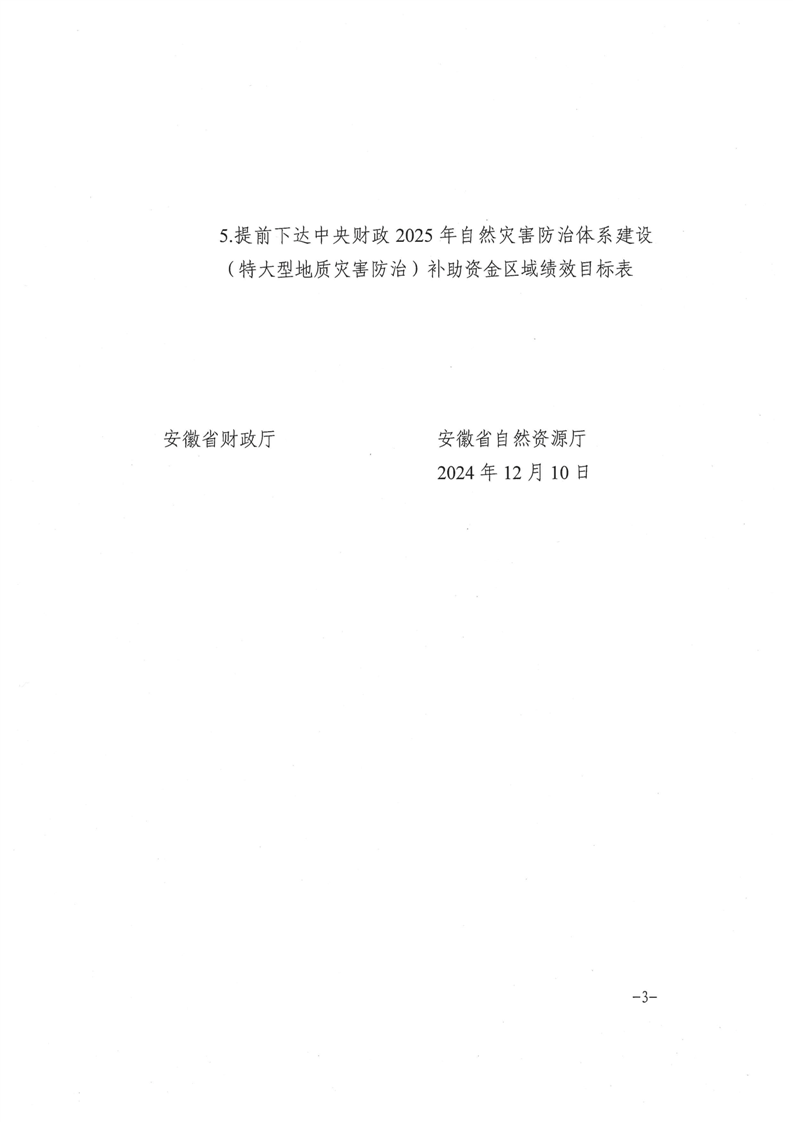 安徽省财政厅 安徽省自然资源厅关于提前下达中央财政2025年自然灾害防治体系建设补助资金的通知