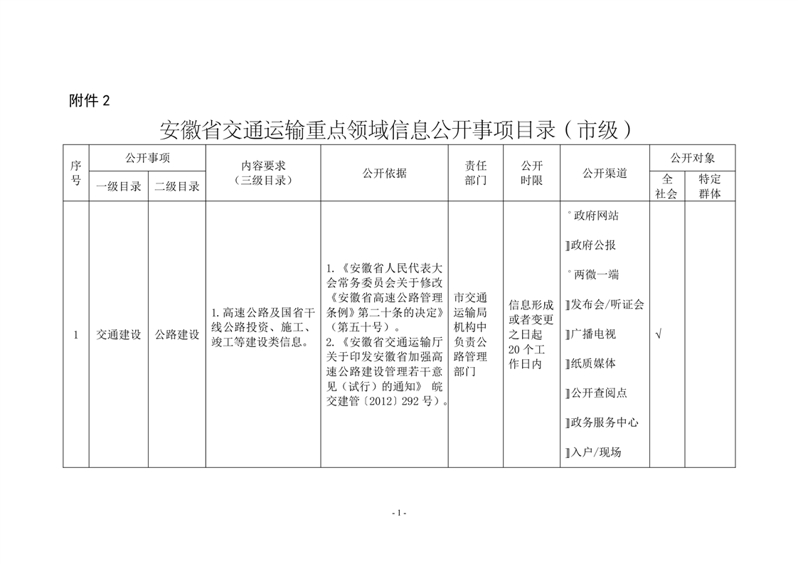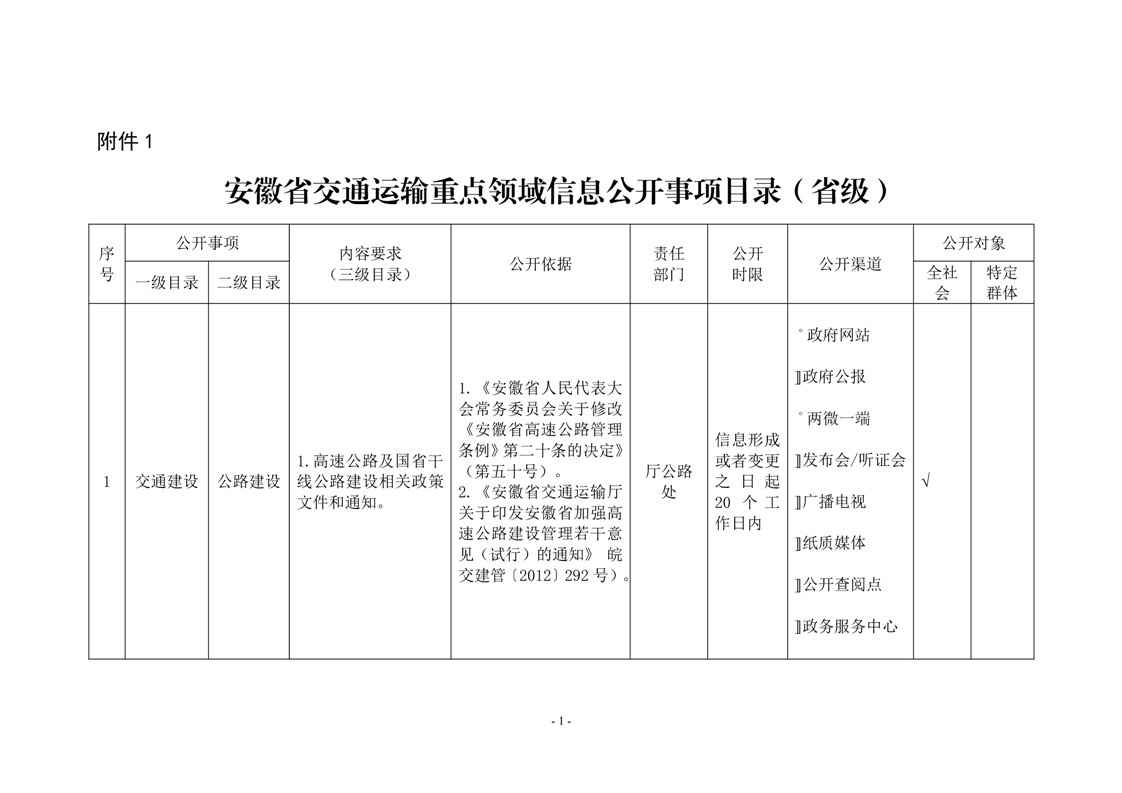 附件:1.安徽省交通运输重点领域信息公开事项目录(省级)