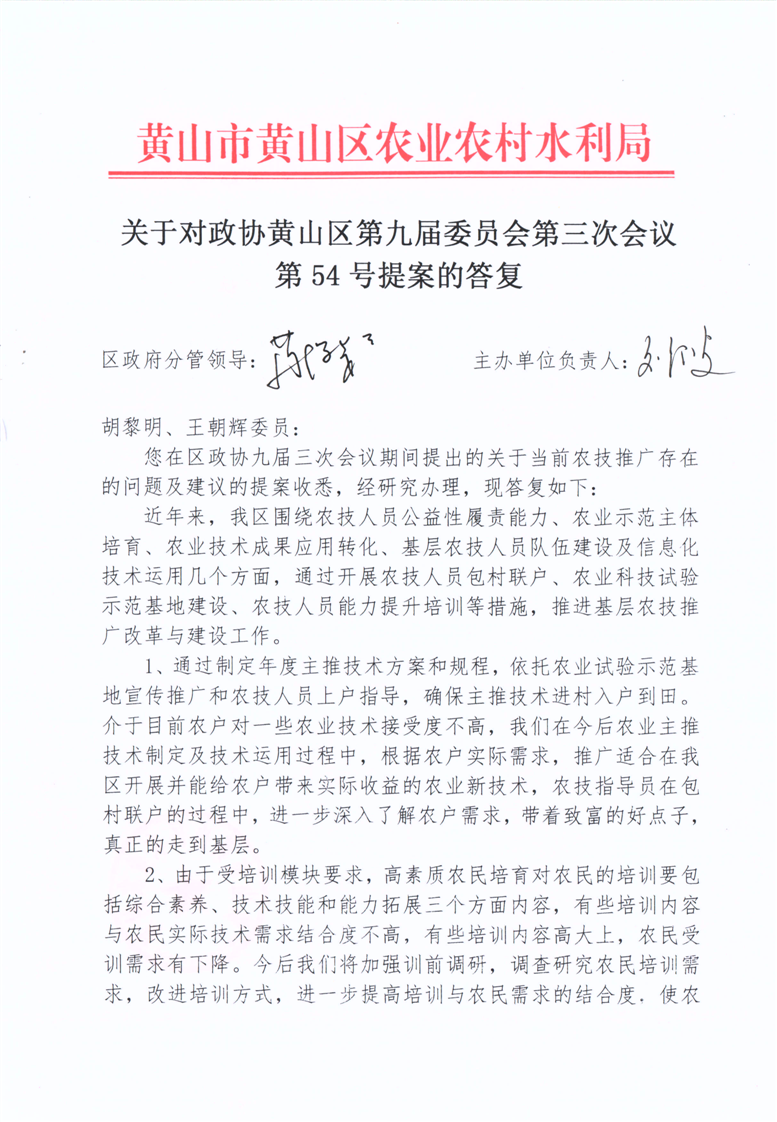 关于对政协黄山区第九届委员会第三次会议第54号提案的答复