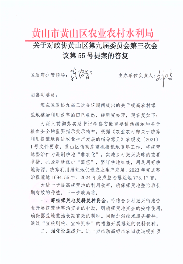 关于对政协黄山区第九届委员会第三次会议第55号提案的答复