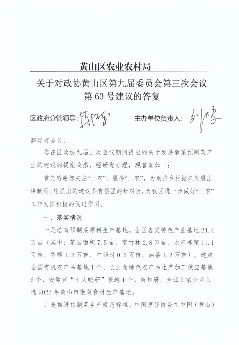 关于对政协黄山区第九届委员会第三次会议第63号提案的答复
