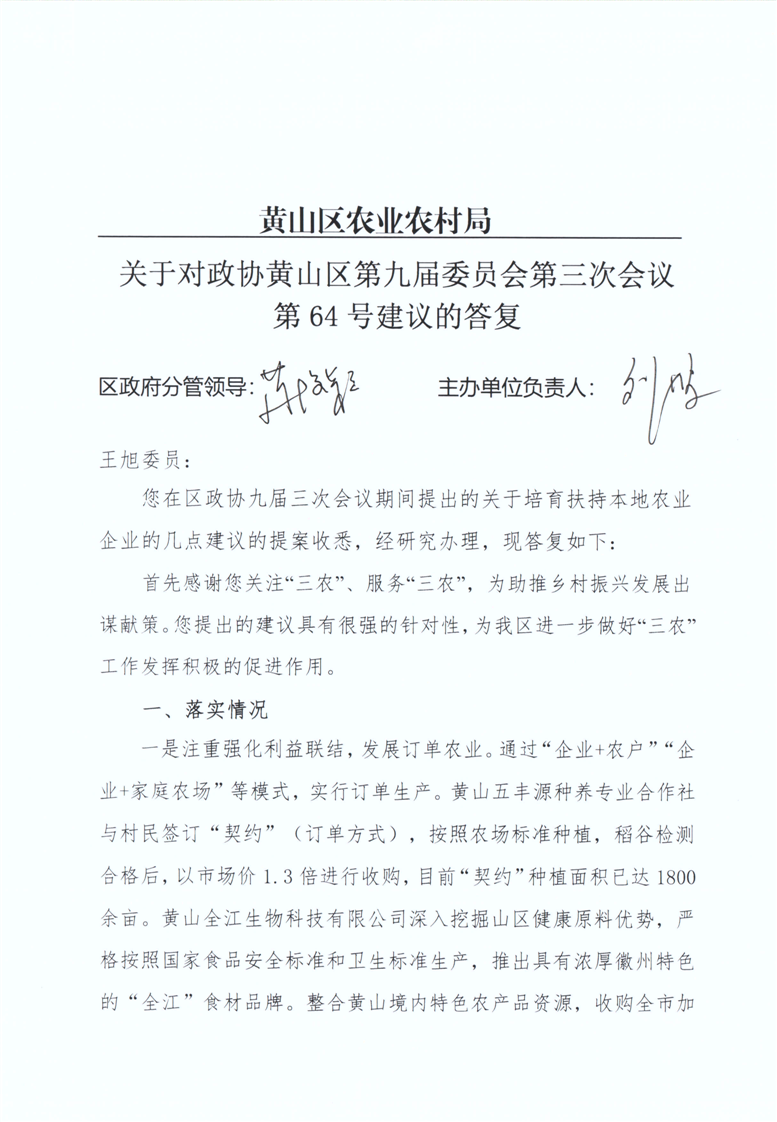 关于对政协黄山区第九届委员会第三次会议第64号提案的答复