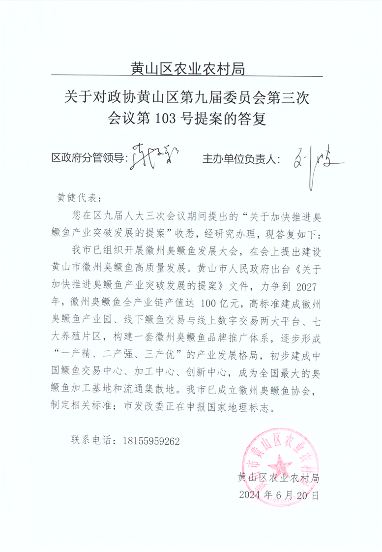 关于对政协黄山区第九届委员会第三次会议第103号提案的答复