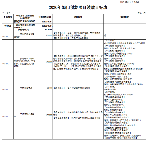 黄山区文化旅游体育局2026年30个项目实行了绩效目标管理,涉及一般公共预算当年财政拨款594.80万元。