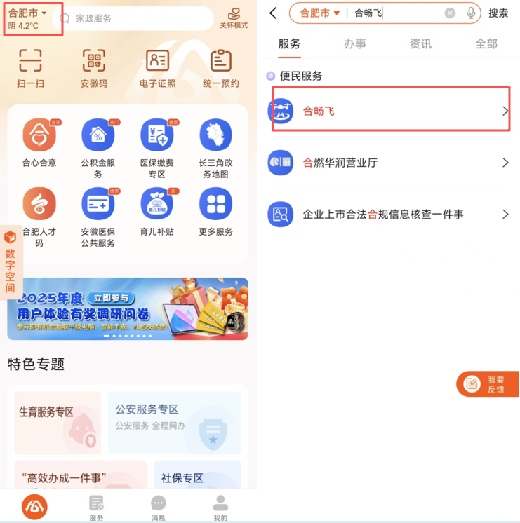 1.登录“皖事通”APP,这里以“合畅飞”为例,切换至“合肥市”,在首页搜索“合畅飞”,点击进入。