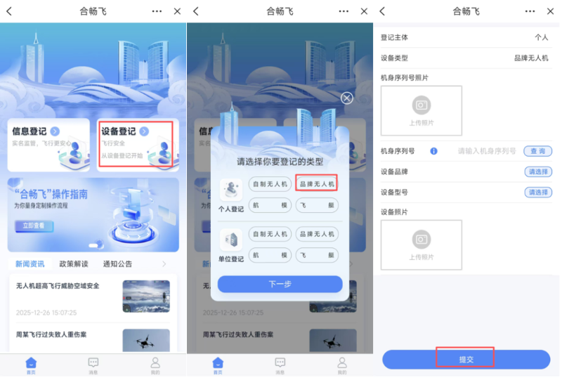 3.点击“设备登记”,根据设备情况,选择相对应的类型进行登记。这里以个人登记“品牌无人机”为例,根据页面提示填写设备信息、上传设备照片等,确认无误后点击“提交”完成登记。