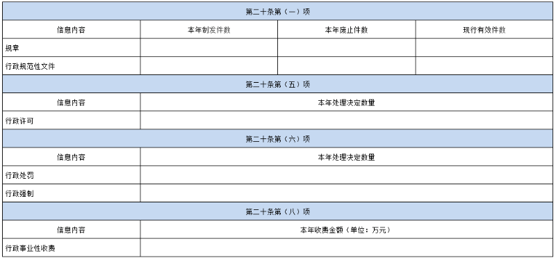 各行政机关年度报告格式模板附后。此前有关政府信息公开的各类报告和统计口径,随原政府信息公开条例的失效而失效。政府信息公开工作主管部门负责汇总的本级政府年度报告格式,参照这一格式模板办理。党的工作机关加挂行政机关牌子的单位,年度报告内容依据全国政府信息公开工作主管部门发布的有关规定(国办公开办函〔2019〕51号)确定,并参照这一格式模板办理。