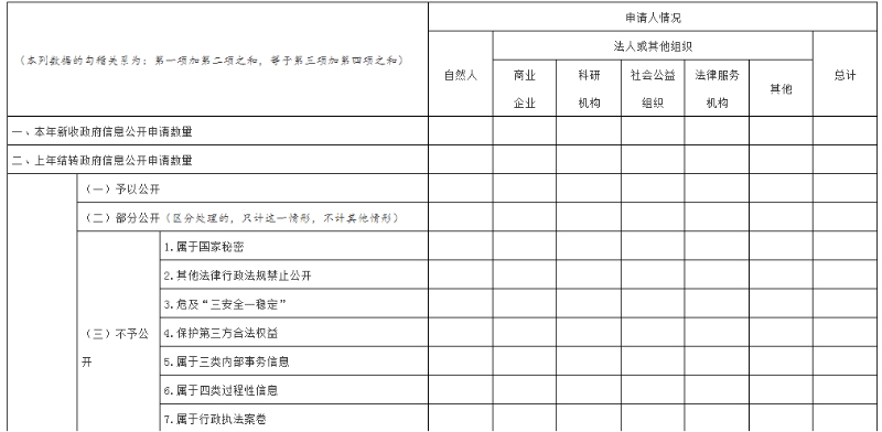 这一项主要报告两方面情况:一是申请人的类别;二是政府信息公开申请的最终处理结果。此项内容重在数据准确、要素齐备,全面客观反映政府信息公开申请接收和办理情况,便于政府信息公开工作主管部门全面掌握工作动态,使社会各界了解政府公开透明进程。