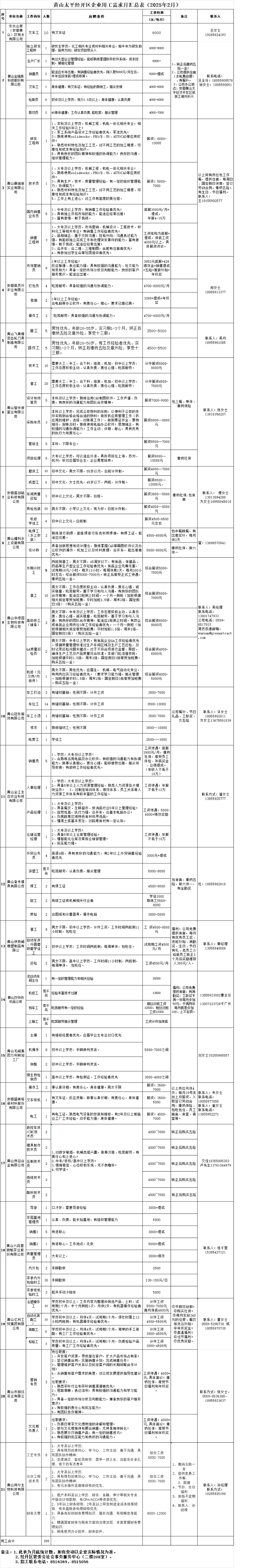 【招聘公告】黄山太平经开区企业用工需求月汇总表(2025年2月)