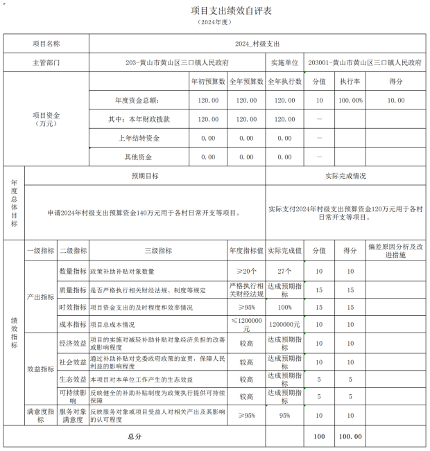 黄山区三口镇人民政府在2024年度部门决算中公开“2024_村级支出”1个项目绩效自评结果。