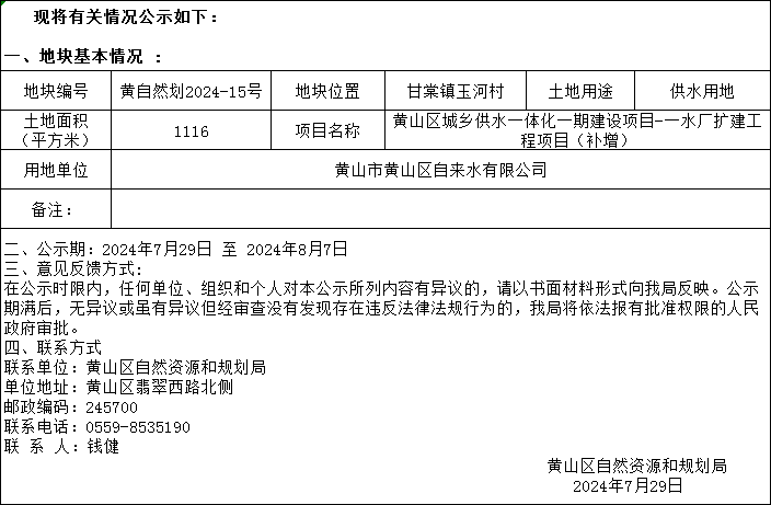 黄山区自然资源和规划局国有土地划拨用地批前公示黄自然划拨2024-4号