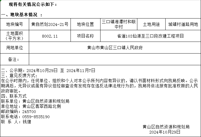 黄山区自然资源和规划局国有土地划拨用地批前公示黄自然划拨2024-6号