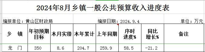 2024年8月份龙门乡一般公共预算收入进度表