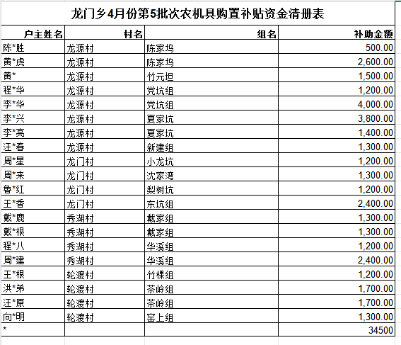 龙门乡4月份第5批次农机具购置补贴资金清册表