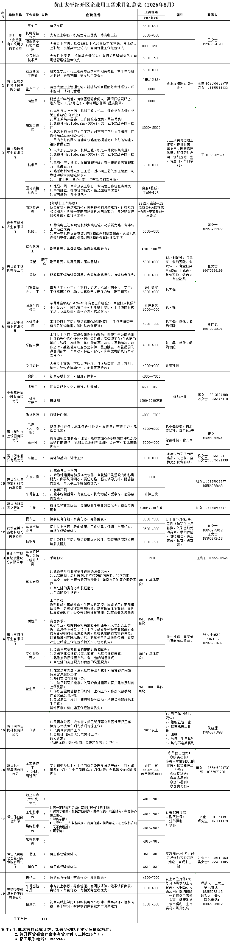 黄山太平经开区企业用工需求月汇总表(2025年8月)